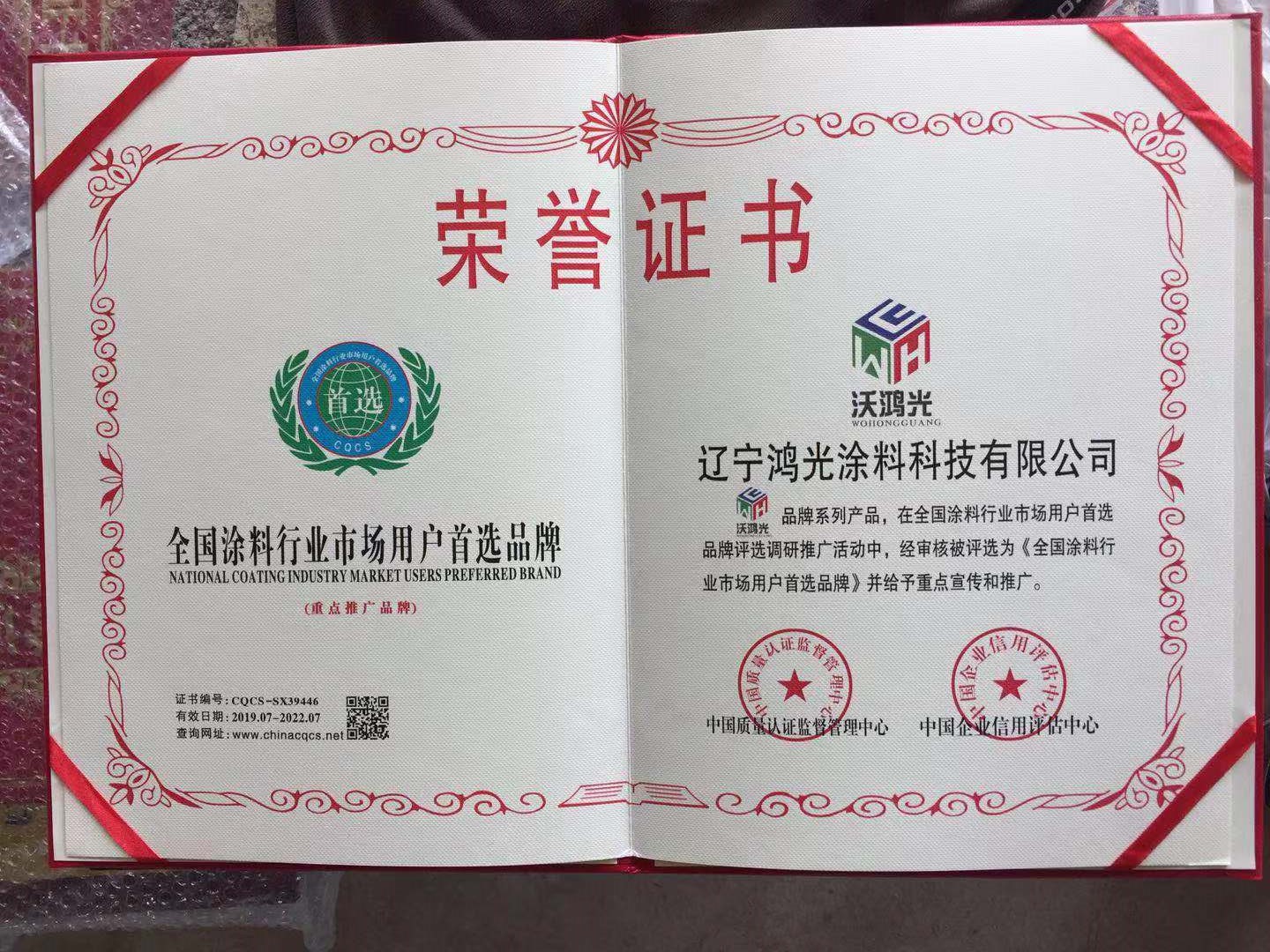 沃鴻光無機(jī)涂料被評(píng)為全國涂料行業(yè)市場用戶首選品牌